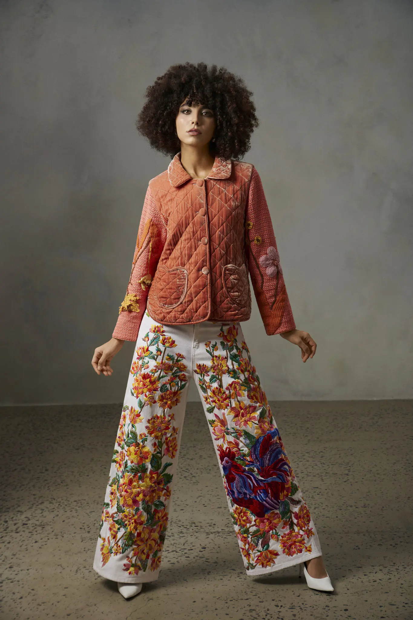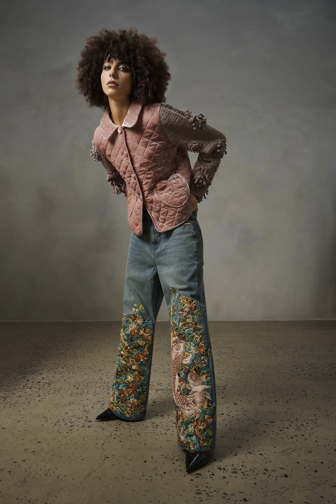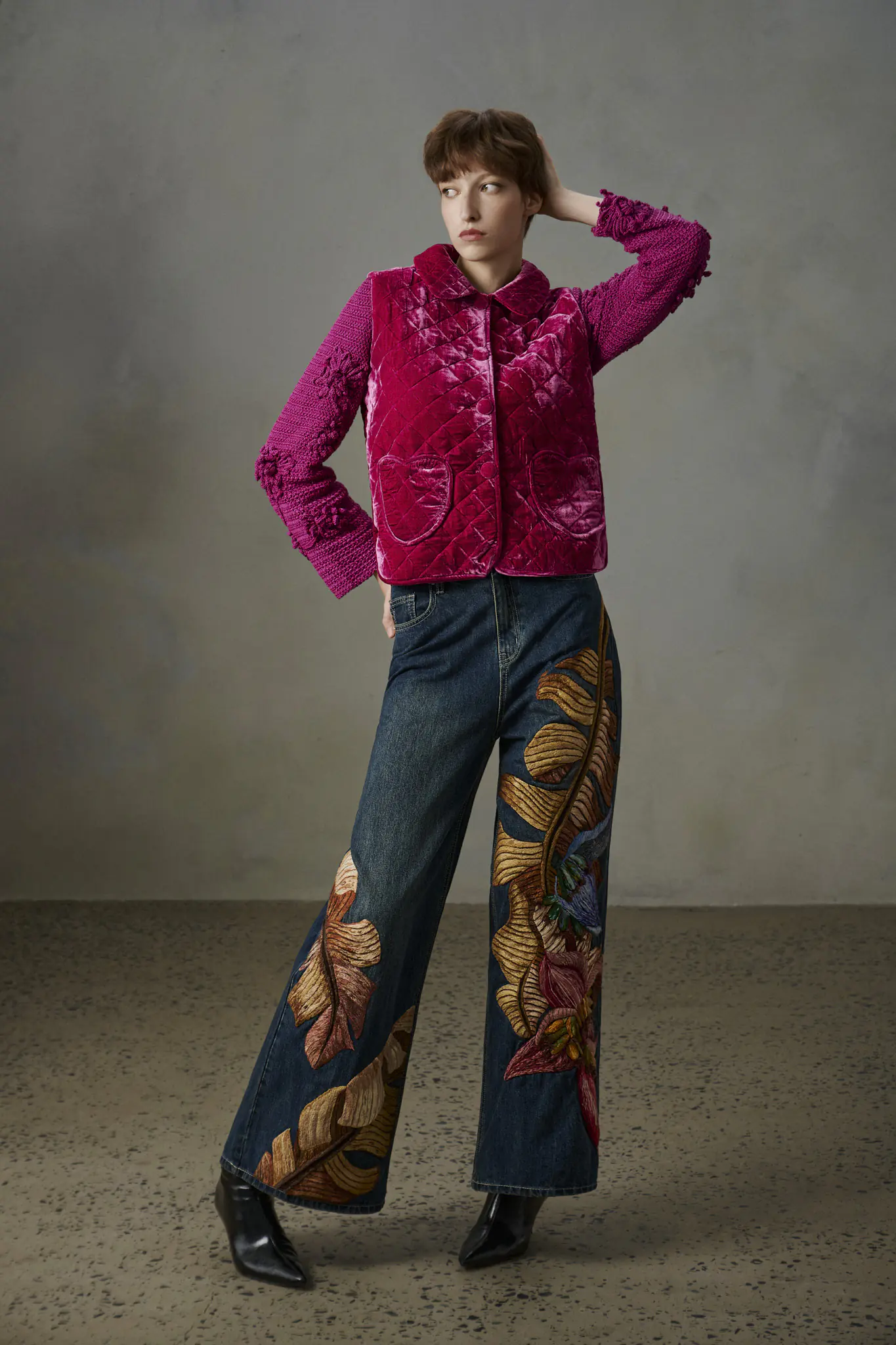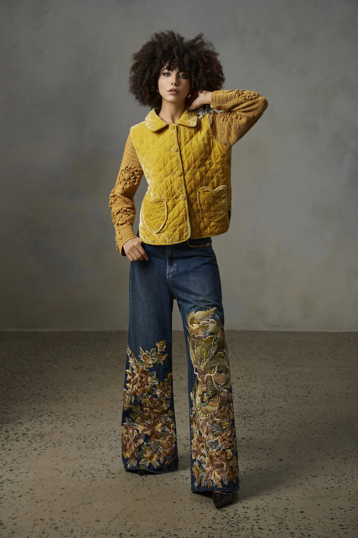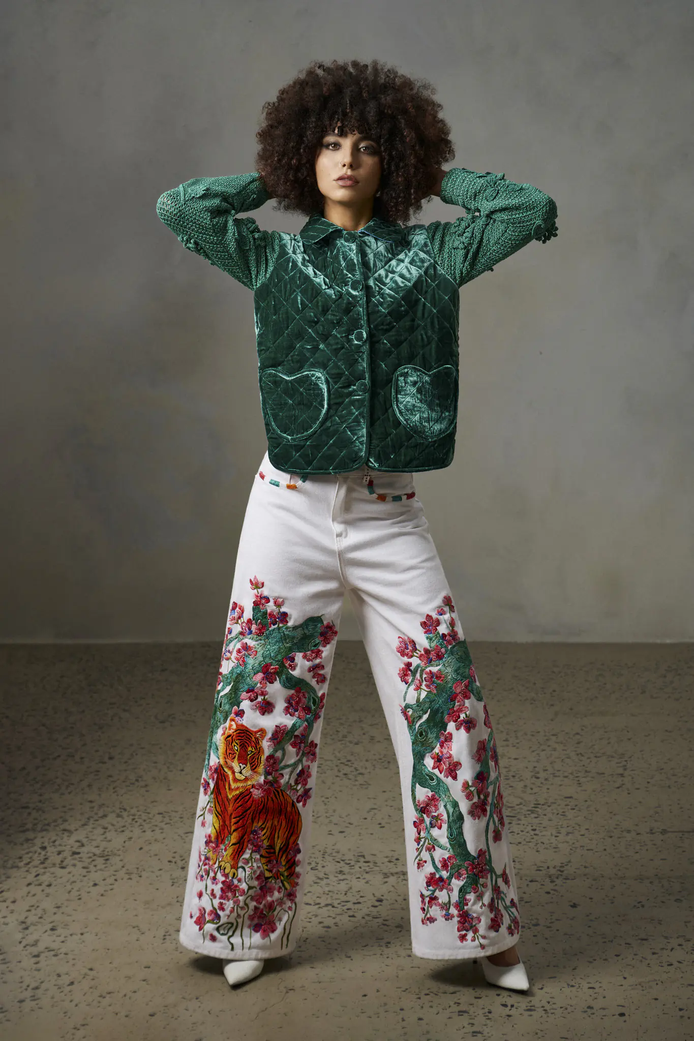 Khi phối cùng quần jean thêu tay, tổng thể vừa mang tính ứng dụng cao, vừa có thể trở thành trang phục mang tính nghệ thuật sàn diễn