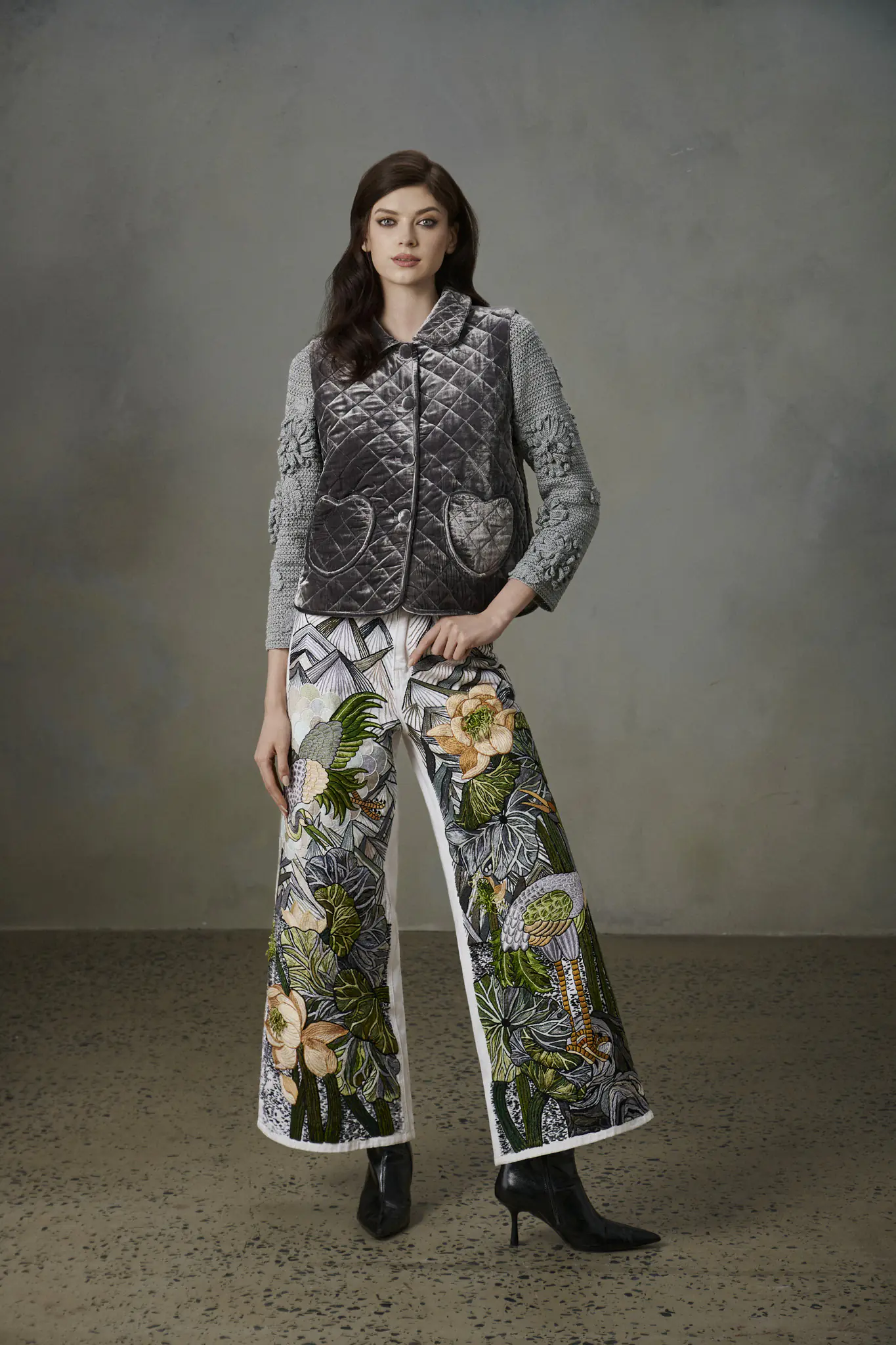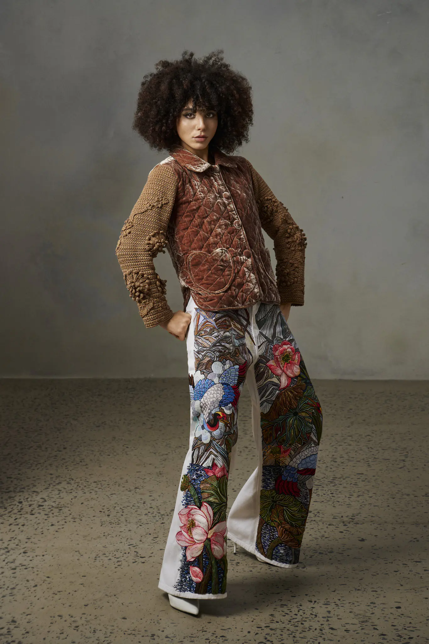 Nếu jean vốn gắn với hình ảnh trẻ trung, phóng khoáng, thì dưới bàn tay Chu Thị Hồng Anh, chất liệu này được nâng tầm thành ngôn ngữ xa xỉ. Các mẫu quần ống rộng thêu tay trong bộ sưu tập gây ấn tượng mạnh: từ hình ảnh cá chép vượt vũ môn đến hạc tung cánh, từ hoa đào, mẫu đơn đến sức mạnh mãnh hổ. Sự phối hợp linh hoạt giữa hoa và linh thú không chỉ làm nổi bật tính biểu tượng, mà còn khẳng định tinh thần sáng tạo mang tính thời đại.