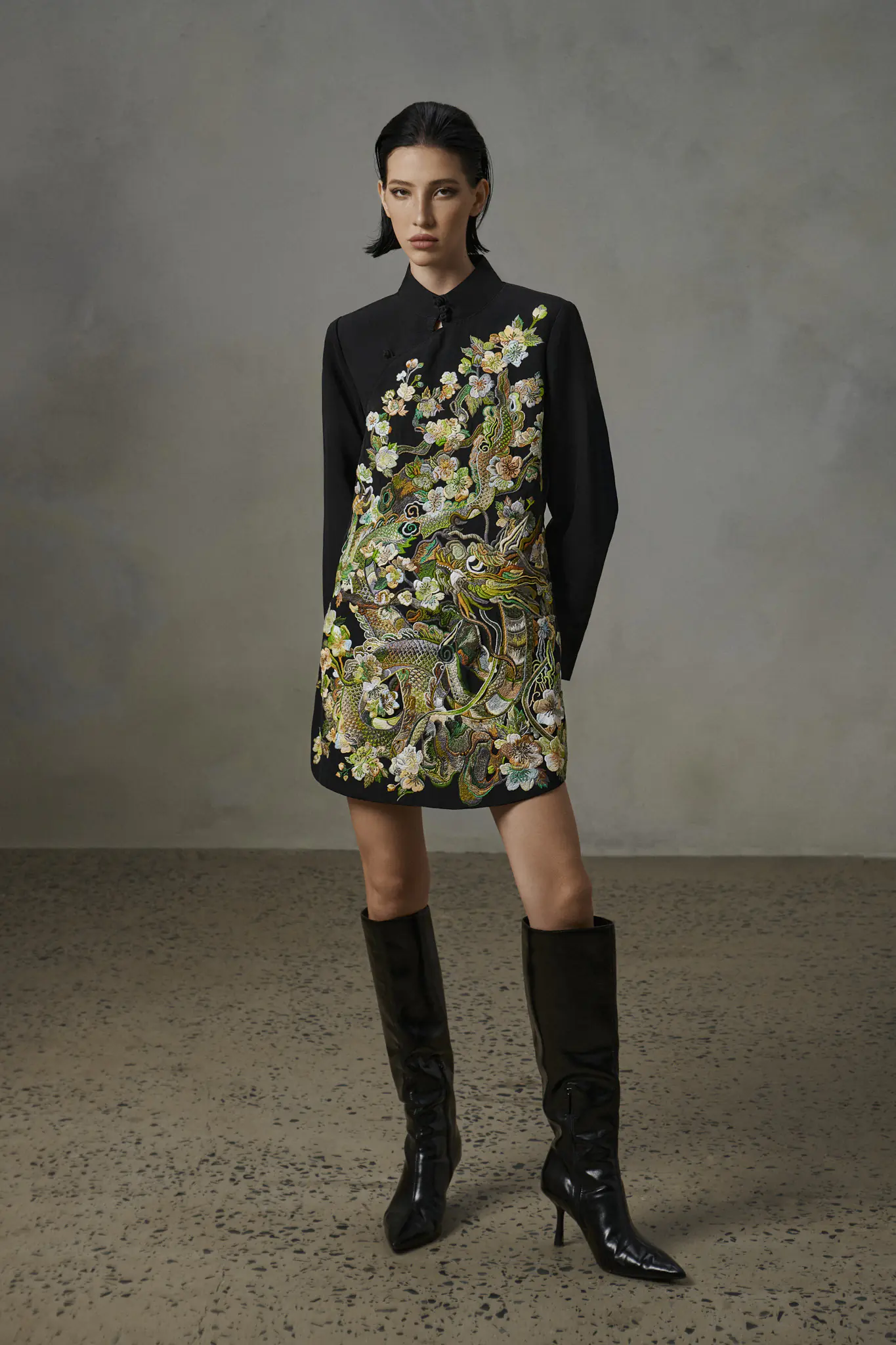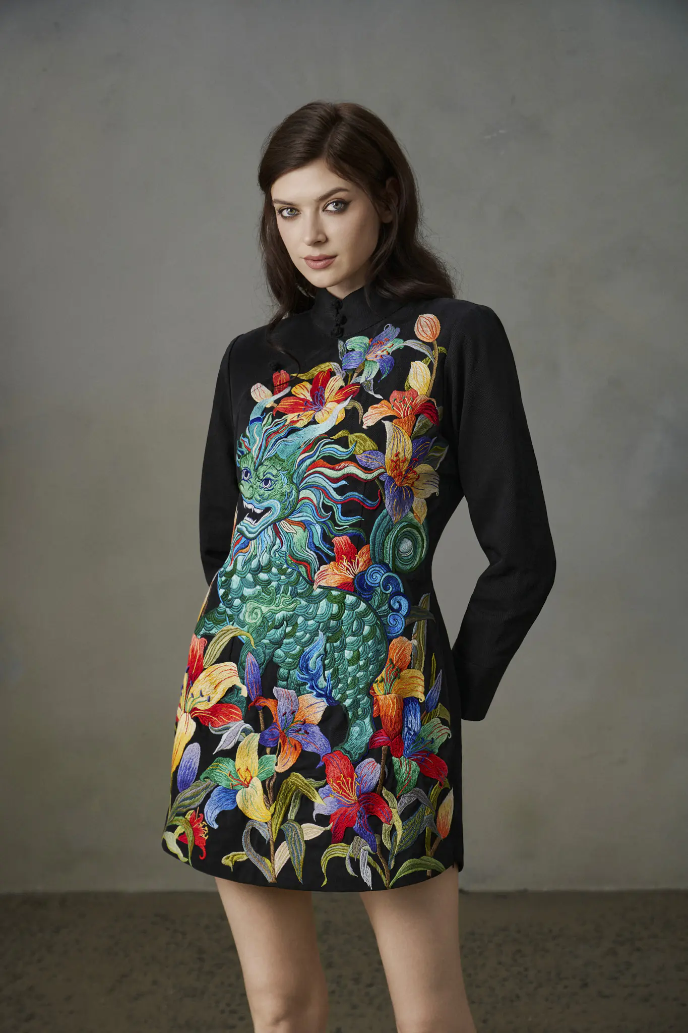 Mỗi bộ trang phục giống như một bức họa, nơi từng mũi chỉ là minh chứng cho sự tỉ mỉ, công phu của nghệ nhân thêu. Với form dáng tối giản, cổ cao, tay dài và kỹ thuật thêu phủ kín thân trước, những chiếc đầm jean trở thành “phù điêu” mang tính biểu tượng, vừa mang nét uy nghiêm, vừa toát lên vẻ nữ tính.