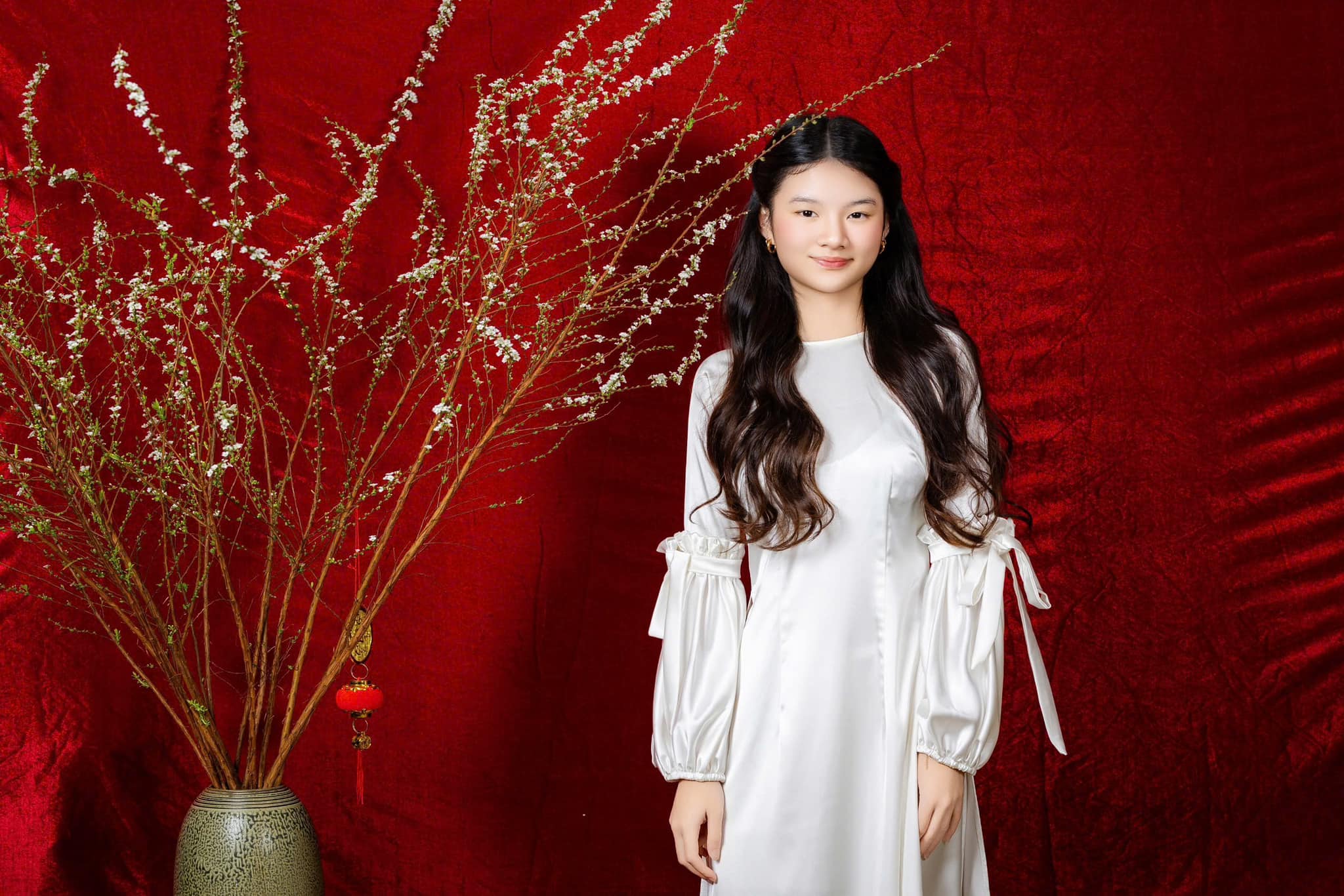 Bước vào tuổi 17, Bảo Tiên sở hữu chiều cao 1m70 nổi bật cùng gương mặt đẹp khả ái như hoa hậu. Cô chọn mặc áo dài giống mẹ, sang trọng và nền nã.