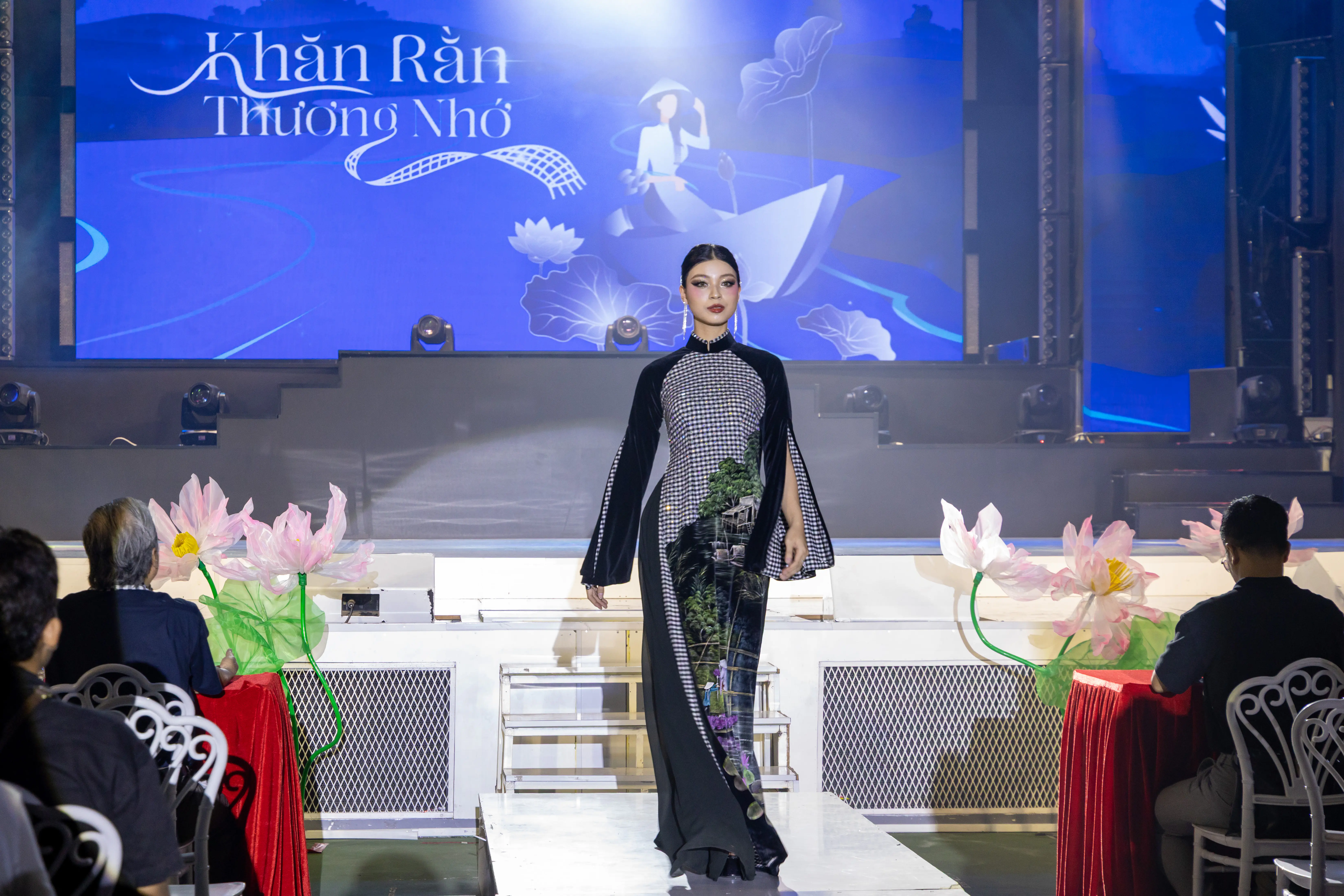 Hai bộ sưu tập áo dài lấy cảm hứng từ chiếc khăn rằn của NTK tài ba Nguyễn Việt Hùng đã mang lại những cảm xúc đặc biệt cho khán giả. Ở bộ sưu tập thứ nhất “Khăn rằn trong kháng chiến”thể hiện trọn vẹn tinh thần kiên cường, bất khuất mà chiếc khăn rằn từng đại diện trong lịch sử dân tộc. Không cần lời thoại hay dẫn chuyện dài dòng, sân khấu khi ấy như tái hiện một miền ký ức – nơi tuổi trẻ từng bước ra chiến khu với niềm tin giản dị nhưng mãnh liệt. Hình ảnh những vùng bưng biền, rừng tràm gợi lại cho người xem ký ức về những chiến khu xưa hay những rừng dừa làm cho ta như thấy lại đội quân tóc dài anh dũng thuở nào.Trong bộ sưu tập này có một chiếc khăn rằn được cách điệu với kích thước khá lớn và điểm đặc biệt của chiếc khăn rằn này chính là hàng ngàn viên pha lê được đính kết tỉ mỉ góp phần tạo nên sự thu hút đặc biệt cho bộ trang phục. Với bộ sưu tập thứ 2 “Khăn rằn trong đời thường là những kiểu áo dài hiện đại, năng động kết hợp giữa họa tiết khăn rằn cùng với những danh thắng nổi tiếng.