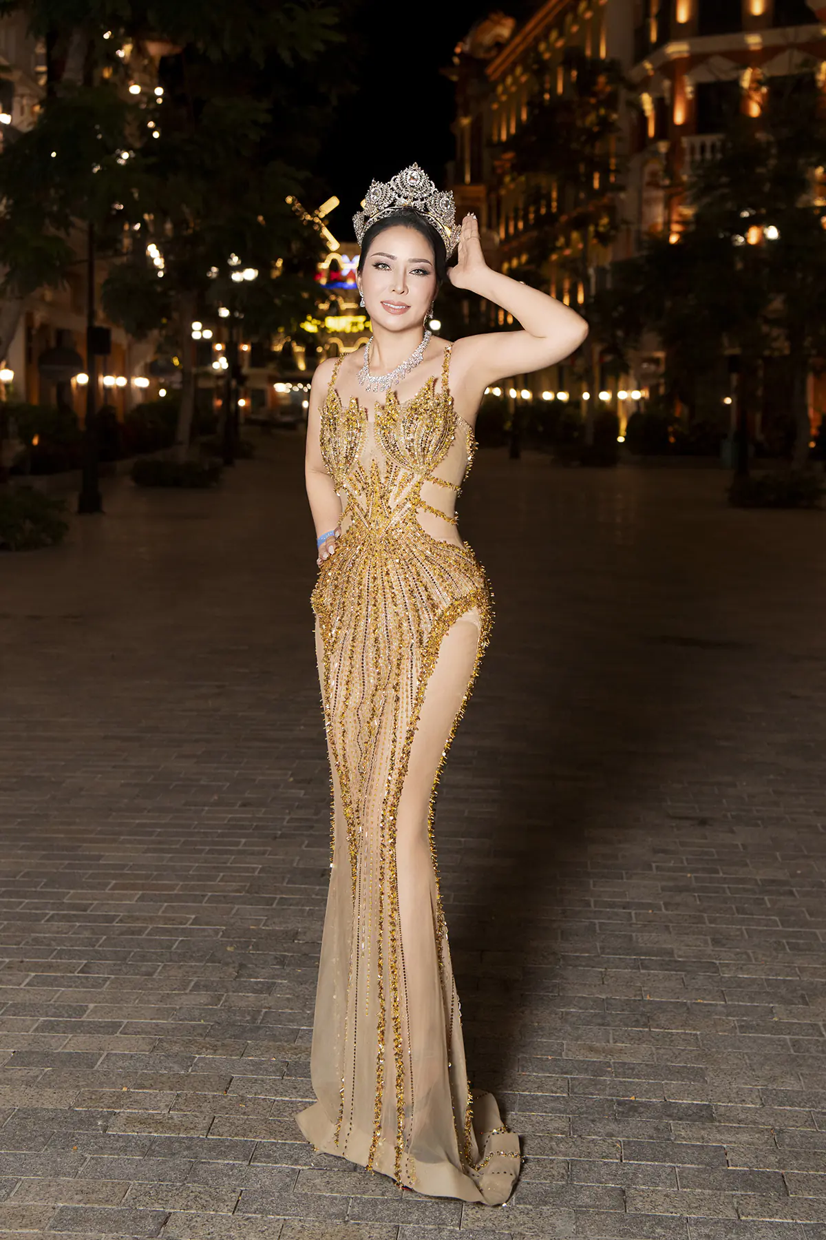Khoác lên mình thiết kế dạ hội cắt xẻ tinh tế, được đính kết thủ công bằng hàng nghìn viên đá nhỏ tạo bước chuyển động dưới ánh sáng lung linh, Hoa hậu Nhân Ái Hằng Nguyễn khoe trọn đường cong gợi cảm nhưng vẫn giữ được nét thanh lịch đặc trưng.