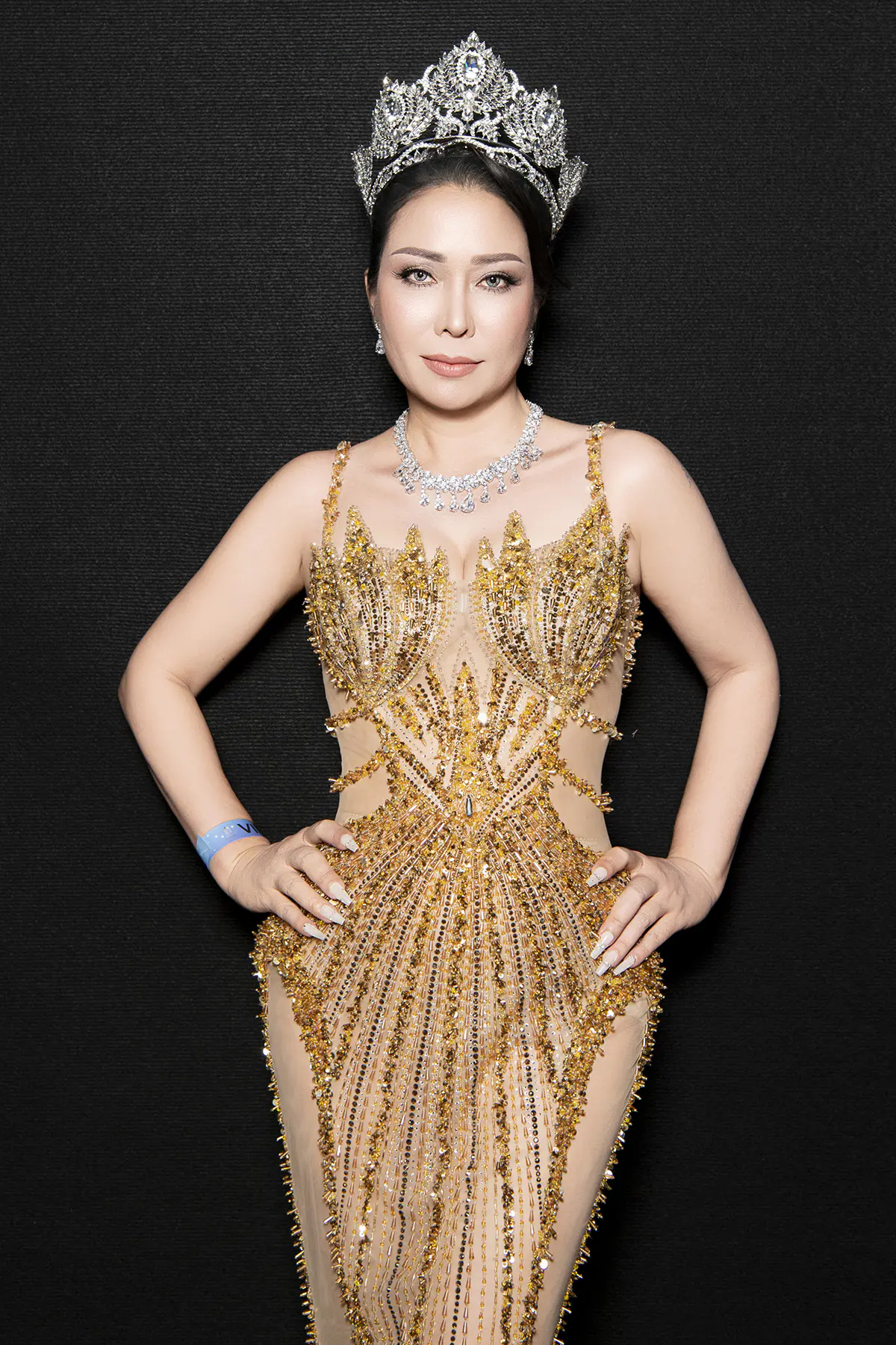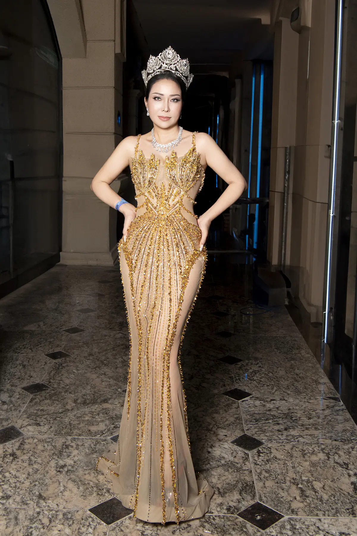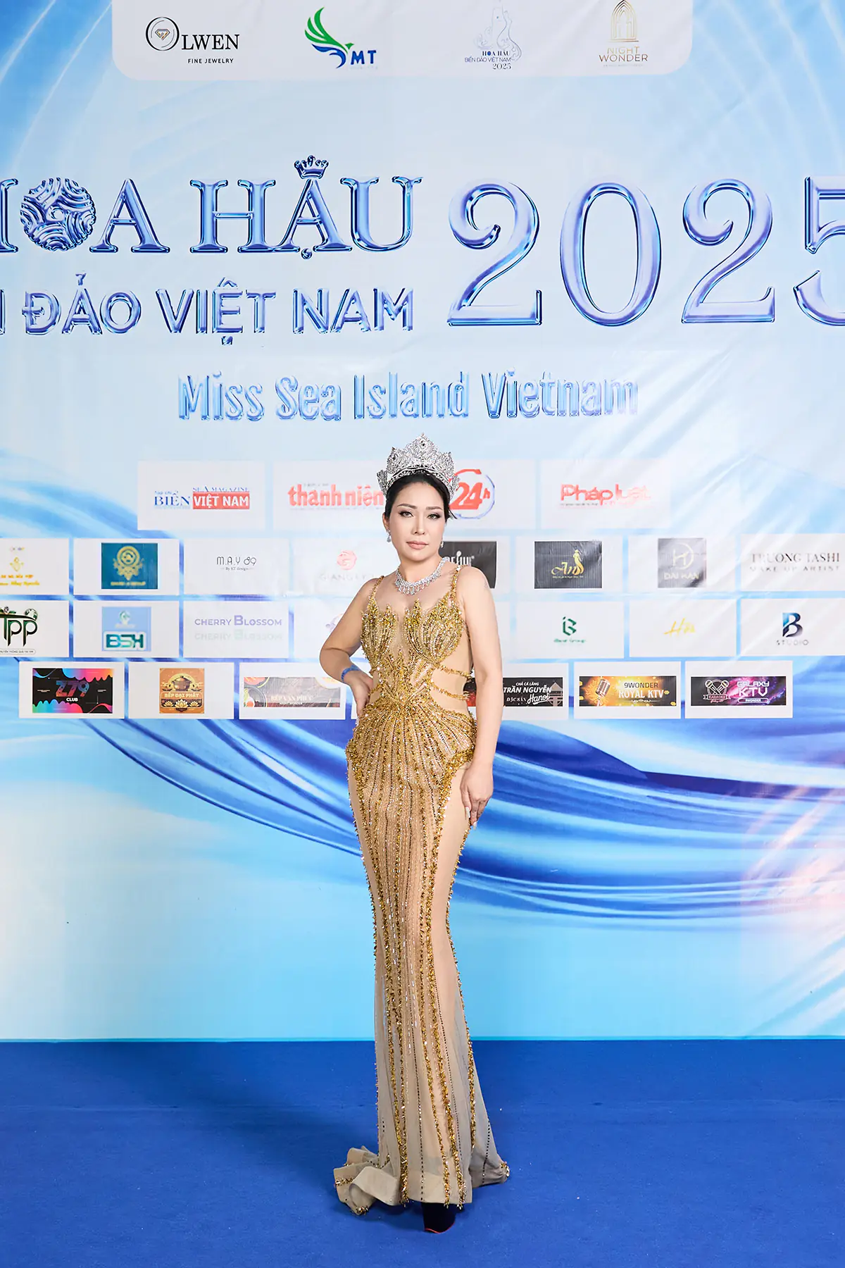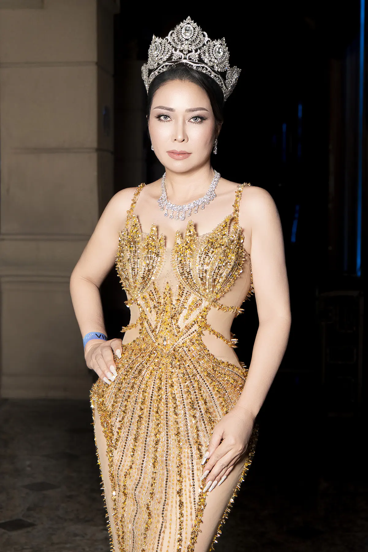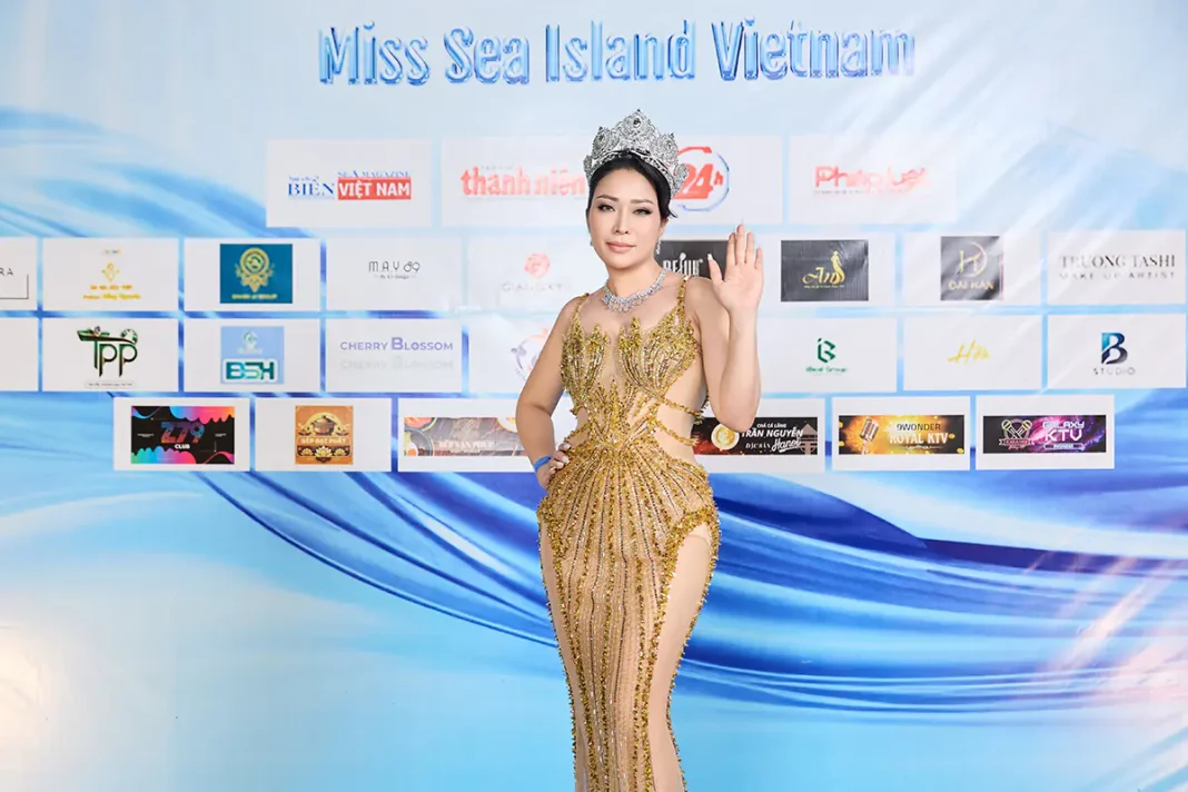 Chiếc vương miện cùng kiểu tóc búi cao càng tôn thêm vẻ quý phái, thần thái sang trọng của nữ doanh nhân xinh đẹp, tài hoa vừa được trao ngôi vị Hoa hậu Nhân ái của cuộc thi Hoa hậu Diva Doanh nhân Việt Nam Quốc tế 2025 cách đó không lâu.